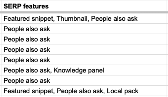 Ahrefs does include SERP features in its export, but dumps them into messy, comma-separated strings — one per keyword. Not exactly analysis-ready. Something like this: