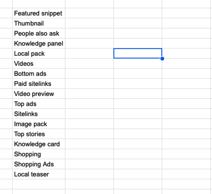 So let's say that the 'SERP features' column in your Google Sheets is in column C